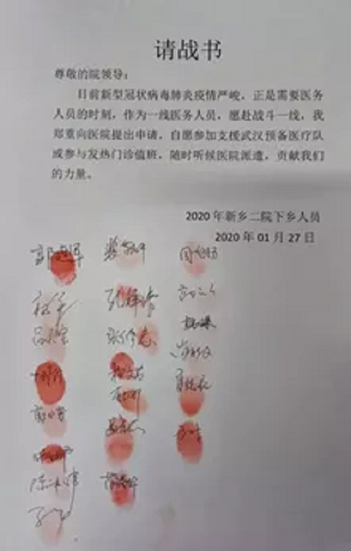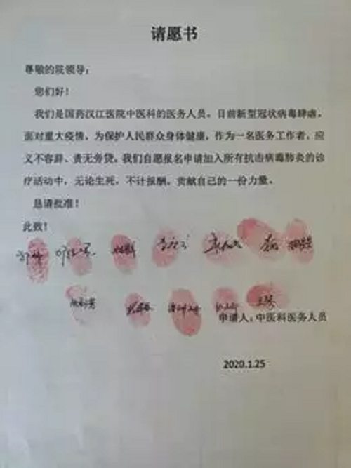 得知发生疫情,沙龙 汉江医院中医科主任郭玮带动医院同事,第一个请愿并庄严地按下红手印:无论生死,不计报酬!