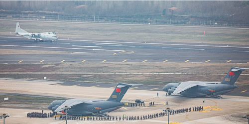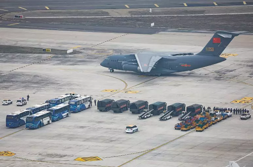 2月13日凌晨,空军出动包括中国自主研制的6架运20在内的3型11架运输机,分别从乌鲁木齐、沈阳、西宁、天津、张家口、成都、重庆等7地机场起飞,向武汉空运军队支援湖北医疗队队员和物资。上午9时30分许,11架运输机全部抵达武汉天河机场。