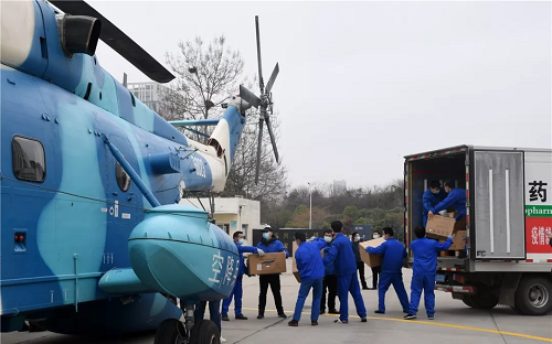 2月12日,应湖北省疫情防控指挥部请求,中部战区紧急调派由航空工业研制生产在驻鄂空降兵某空中突击旅直升机团服役的两架国产直8大型运输直升机,由武汉市向襄阳、宜昌地区转运口罩、防护服、手套、药品等600件共计4吨防疫医疗急需药品和紧缺物资。