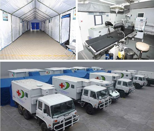“移动医院”装备共涉及手术车、医技车、通讯指挥车、水电油保障车、生活车、宿营车等近10种特种车辆,展开后就相当于一所二级甲等综合医院,机动性好、模块化组合、展开部署快速、救治功能范围广等,能够完成手术、急诊、急救任务,同时可以保障救援人员的基本生活所需。
