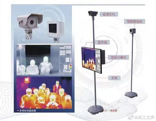 中国兵器工业集团夜视研究院研制出适用于大范围人群测温的“20-I型红外发热人群快速筛选系统”,采用非接触式工作模式,具备人脸自动检测技术,4~10米范围实现全自动24小时连续实时测温和超温识别预警;测温效率每分钟约500人次,精度±0.3℃。春节期间紧急安排生产,600余支手持测温热像仪和在线式测温热像仪测温镜头发往抗击疫情第一线;第二批1000余支将于近期完成供货。