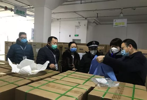 2020年2月15日,北京市药监局相关领导第一时间到现场查看物资筹备情况,并完成首批应急防控物资调出,沙龙 器械北京公司经营班子及相关部门负责人参与物资交付。
