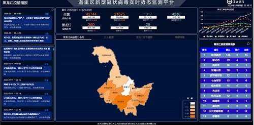 道里区新型冠状病毒实时势态监测平台,基于正元时空大数据平台,应用互联网数据感知引擎,实时感知、汇聚疫情相关信息,同时系统集成新闻播报、地理展示、疫情洞察等功能,为疫情指挥提供信息支撑和可视化工具,为疫情工作决策提供全方位支撑。系统从接到任务,设计、研发、测试、上线仅用1天时间,及时助力道里区抗击肺炎疫情工作。