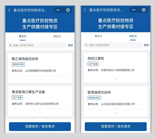 目前,供需对接平台已在新华网客户端、央企电商联盟等平台上线。截至2月22日,平台共累计上传657家企业防控物资的964条供需信息,撮合30家企业开展对接,物资类别涵盖熔喷布、泵头等原材料和口罩、防护服、酒精等。