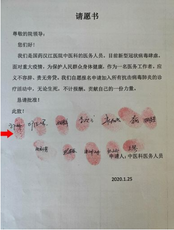 得知发生疫情,沙龙 汉江医院中医科主任郭玮带动医院同事,第一个请愿并庄严地按下红手印:无论生死,不计报酬!在进入病区当天他才告知家人,顾不上年仅8岁的儿子和患有严重的心脏病的妈妈,为了发挥中医在治疗中的优势,她坚持每天为患者看舌苔、把脉,把中西医结合运用到极致,将患者病情控制好。腰椎间盘突出症的老毛病令她常常弯着腰不能动,但她仍带病进入医学隔离区连续工作6天,领导提出让她撤下来休息,可她说:“病人需要我,我能行!”