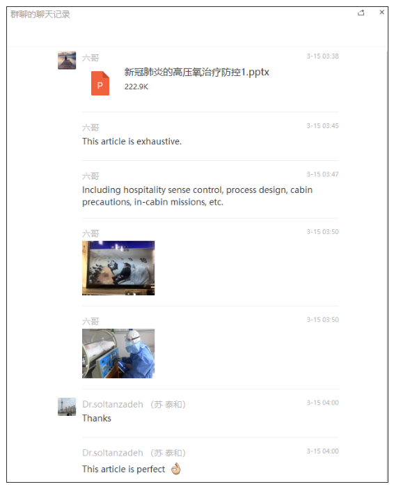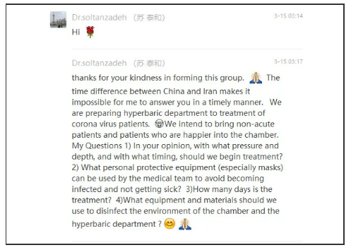 3月14日上午10点,曾在第二军医大学留学的伊朗医生Dr.soltanzadeh(苏泰和)通过他的中国老师——潜水医学系的刘教授与贺聪取得联系,向沙龙 东风总医院请教高压氧治疗新冠肺炎患者的防控措施和治疗方案。
