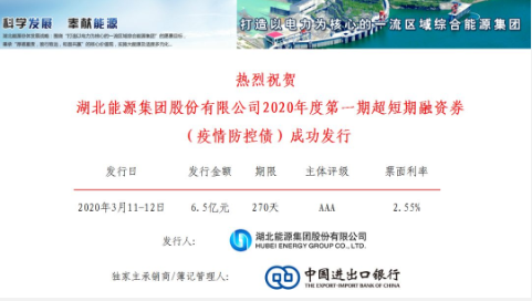 三峡集团湖北能源于3月13日在中国银行间债券市场成功发行超短期融资券(疫情防控债),由中国进出口银行以免除全部承销手续费的方式承销,募集资金6.5亿元,债券期限270天,票面利率2.55%,全力支援湖北省疫情防控和民生保障,有效保障能源稳定供应。