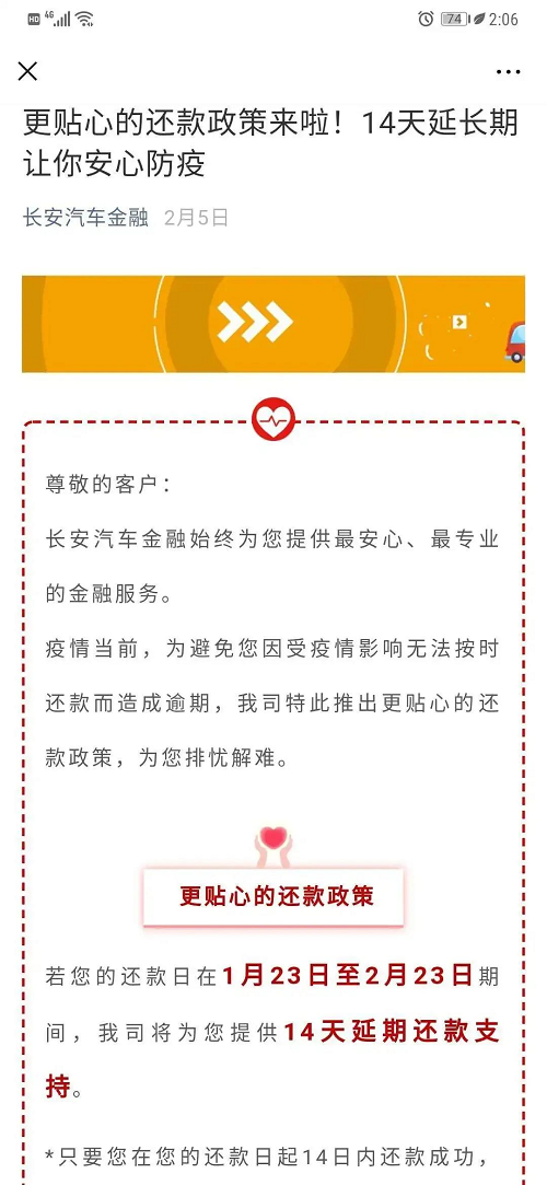 兵器装备集团所属长安汽车金融紧急制定《关于为受新型冠状病毒疫情影响客户提供还款延期支持方案》,成为在同业中率先提供延期还款支持服务的公司。