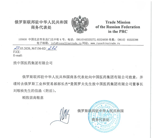 俄罗斯联邦工业和贸易部部长杰·曼图罗夫致信中国医药集团有限公司董事长刘敬桢,代表俄罗斯联邦政府感谢刘敬桢董事长为组织对俄罗斯供应医疗物资所做的工作。