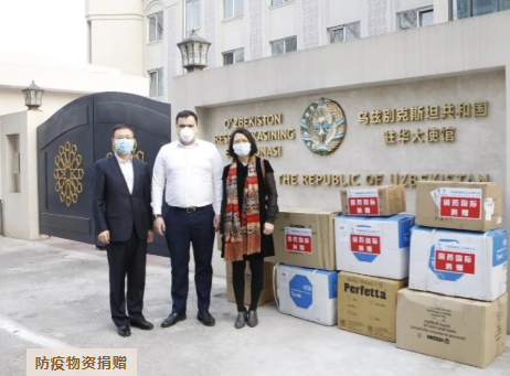 国际关注到重点贸易合作国别——乌兹别克斯坦的疫情状况,立即与乌兹别克斯坦驻中国大使馆取得联系,第一时间筹集了一批包括口罩、防护服和护目镜等防疫物资,并于3月24日下午,向乌兹别克斯坦驻华大使馆进行了捐赠。