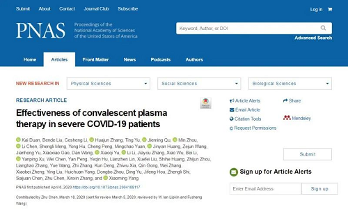 中国生物对于新冠肺炎康复者血浆治疗技术的科学探索已经走到了国际前列。中国生物依据Ⅰ期临床试验结果,总结了康复者恢复期血浆治疗的有效性及安全性,于3月18日向权威学术期刊《美国科学院院报》投稿。4月6日,《美国科学院院报》在线刊发了中国生物研究团队发表的《采用康复者血浆疗法治疗10例新冠患者的有效性及安全性初步研究》。