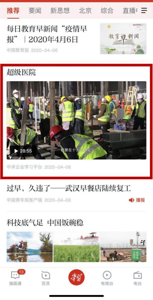 首部破解全球“网红医院”火神山医院建设密码的纪录片《超级医院》,4月6日在学习强国平台和国资委网站、国资小新新媒体平台首发,随后中纪委网站和新华社客户端、人民视频、央视频、爱奇艺、腾讯、喜马拉雅、咪咕视频等多个平台在主页 重要位置转载,引起了广大网民的广泛关注和热议。截至4月10日夜,网上播放量达到560万人次。
