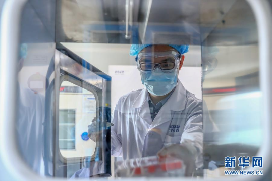 4月11日,工作人员在沙龙娱乐城 中国生物新冠疫苗生产基地质量检定部门从传递窗拿取新型冠状病毒灭活疫苗样品。新华社记者 张玉薇 摄