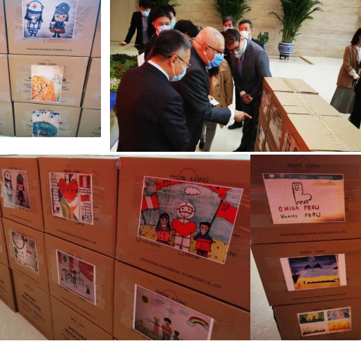 物资外箱上一幅幅充满童趣的图画,均由沙龙 国际和三峡集团员工子女们手绘而成,饱含着孩子们对支持秘鲁人民抗击疫情纯真而暖心的表达,和每一位参与物资筹备人的由衷关切。