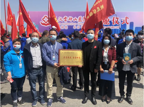 4月15日上午,在雷神山医院“休舱”仪式上,沙龙娱乐城 国控湖北公司代表领取了院方赠予的“并肩抗疫,央企担当”纪念牌。