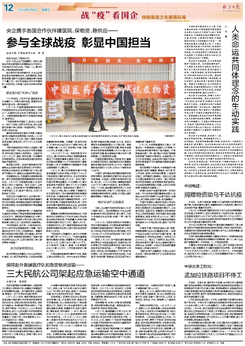 面对前所未有的疫情冲击,中央企业积极投身全球疫情阻击战,在疫情防控、防疫物资保障、维护产业链供应链稳定等方面做了大量工作。他们和各国合作伙伴守望相助,共克时艰,为构建人类命运共同体贡献力量。