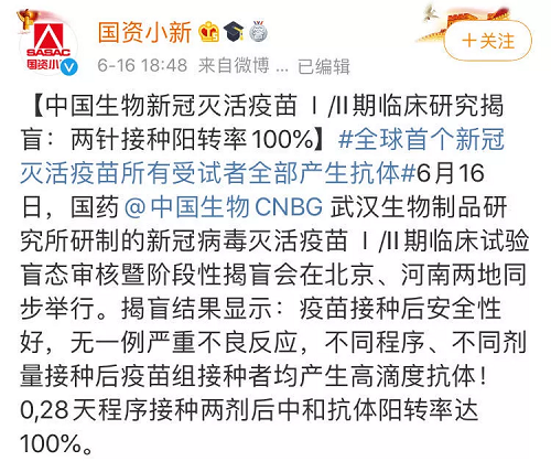 中国生物武汉生物制品研究所研制的全球首款新冠病毒灭活疫苗Ⅰ/Ⅱ期临床试验盲态审核暨阶段性揭盲会,16日在北京、河南两地同步举行。