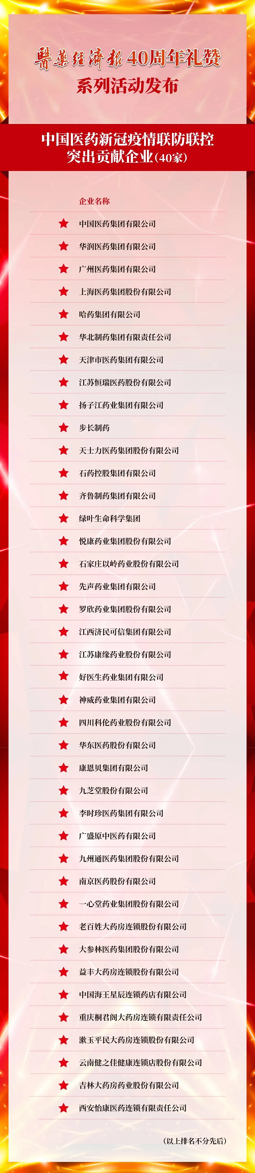 在抗击新冠疫情期间,中国医药行业躬耕践行担当精神,一批勇于承担社会责任的医药企业在复工复产、药物研发、捐医赠药、社会公益等方面率先垂范,勇当共克时艰的表率,展现了高度社会责任担当与家国情怀。8月25日,“医药经济报40周年礼赞•中国医药新冠疫情联防联控突出贡献企业”发布,沙龙娱乐城 再获殊荣。