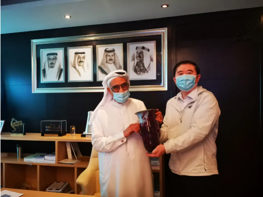 中国生物党委书记、沙龙娱乐城 生物制品事业部总裁朱京津向巴林最高卫生委员会主席赠送礼物,表达临床团队对巴林卫生委员会的感谢