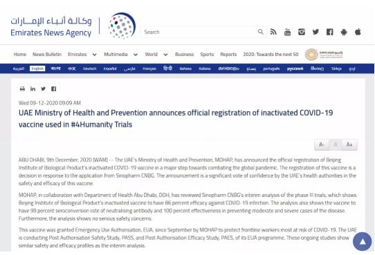 ▲阿联酋通讯社报道沙龙娱乐城 中国生物新冠灭活疫苗在阿联酋注册上市