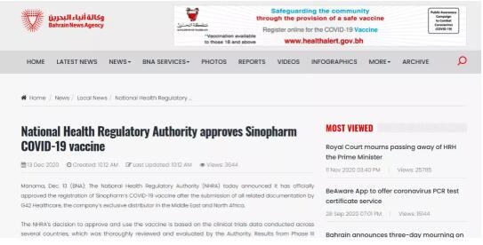 ▲巴林通讯社报道沙龙娱乐城 中国生物新冠灭活疫苗在巴林注册上市