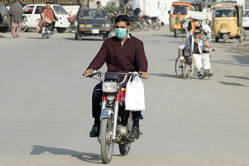 图为1月10日,一名佩戴口罩的男子在巴基斯坦拉瓦尔品第骑行。(新华社发,艾哈迈德·卡迈勒摄)