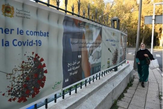 2020年12月15日,一名女士走过摩洛哥拉巴特街头一处关于新冠疫苗的宣传海报。(新华社发)