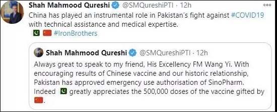 1月21日,国务委员兼外长王毅应约同巴基斯坦外长库雷希通电话。王毅表示,中国政府已决定向巴方提供疫苗援助,并积极协调中国企业加快向巴方出口疫苗。库雷希代表巴政府和人民感谢中国政府决定向巴方提供疫苗援助并提供采购便利。库雷希表示,巴方已批准中国沙龙娱乐城 疫苗紧急使用授权,将积极考虑批准其他中国疫苗市场准入。同一天,库雷希在社交媒体上宣布,中国将向巴基斯坦赠送50万剂新冠疫苗,他们对此表示“非常感激”。