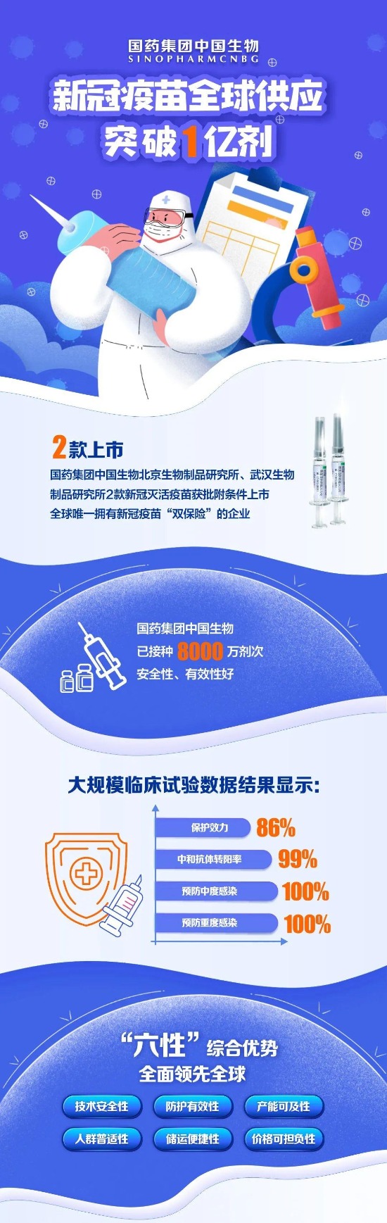 3月26日,沙龙娱乐城 中国生物北京生物制品研究所、武汉生物制品研究所两款新冠疫苗累计供应全球突破1亿剂。截至目前,已有50个国家和地区批准沙龙娱乐城 中国生物新冠疫苗注册上市或紧急使用,接种超过8000万剂次,接种人群覆盖190多个国别,得到国际社会广泛认可与高度赞誉。