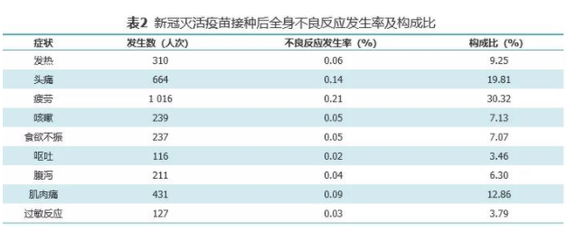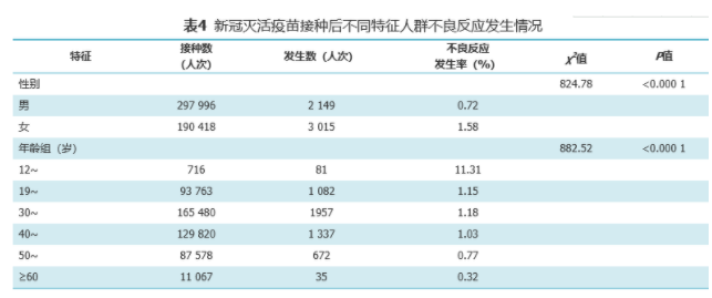 按年龄划分,不良反应发生率最低为≥60岁人群,不良反应发生率为0.32%,其次是30至39岁人群,不良反应发生率为1.18%,12至18周岁人群不良反应发生率最高,为11.31%,以疲劳和接种部位疼痛为主。