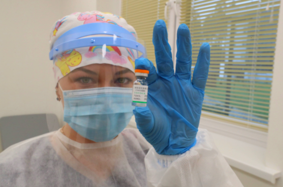4月16日,在白俄罗斯首都明斯克郊区的中白工业园,医务人员展示中国沙龙娱乐城 研制和生产的新冠灭活疫苗。