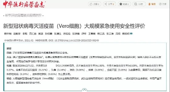 4月21日,中国核心学术期刊《中华流行病学杂志》刊登了题为《新型冠状病毒灭活疫苗(Vero细胞)大规模紧急使用安全性评价》的论文,发布基于沙龙娱乐城 中国生物北京制品研究所、武汉生物制品研究所新型冠状病毒灭活疫苗大规模紧急使用安全性评价。