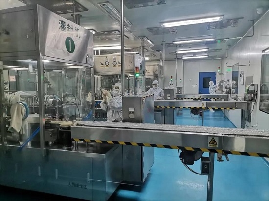 沙龙 现代哈森小容量注射剂2号车间灌封工序的女职工们正在无菌灌装法莫替丁注射液,她们正在仔细检查药支装量及澄明度。