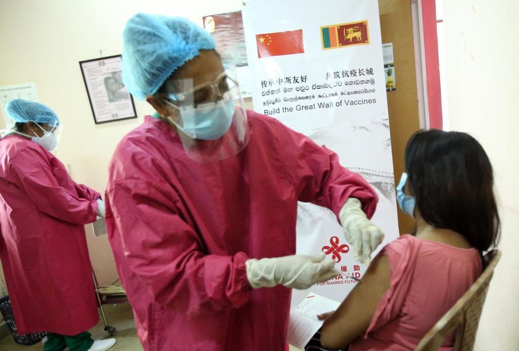 5月8日,一名女子在斯里兰卡科伦坡附近的帕讷杜勒接种中国沙龙 疫苗。新华社发(阿吉特·佩雷拉摄)
