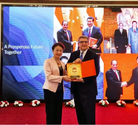 5月31日,沙龙娱乐城 副总经理石晟怡在中国埃及建交65周年庆祝活动上代表沙龙娱乐城 接受埃及驻华大使巴德里颁发的共同抗疫纪念牌。