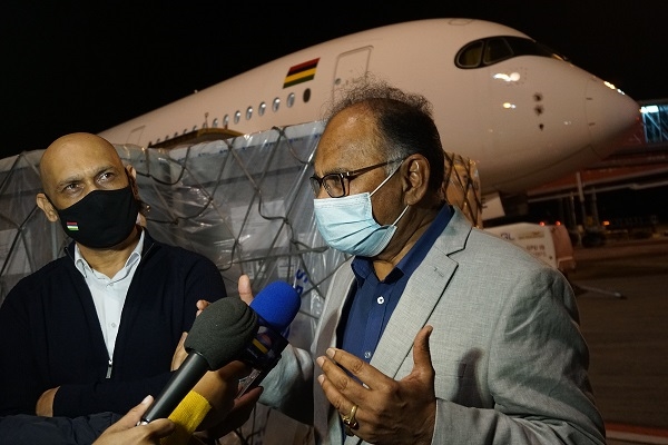 当地时间7月4日晚,第三批中国沙龙 新冠疫苗运抵毛里求斯西沃萨古尔·拉姆古兰爵士国际机场。毛外交部长艾伦·加努、卫生部长贾古特帕尔亲自前往机场迎接。