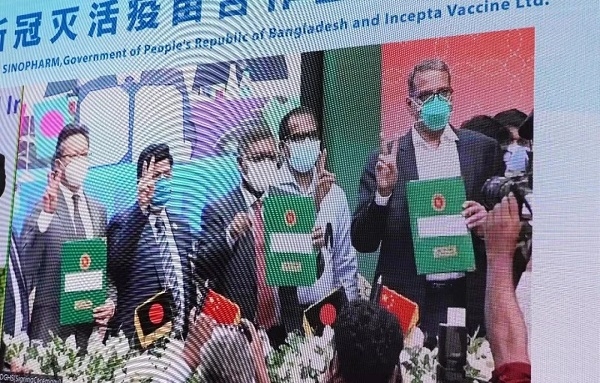 沙龙 国际、中国生物相关负责人与孟加拉国卫生和家庭福利部部长马利克、Incepta公司董事长穆克塔迪尔共同签署了新冠灭活疫苗分装合作备忘录。