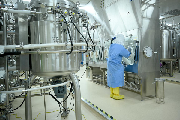 工作人员在全球最大新冠疫苗生产基地中操作