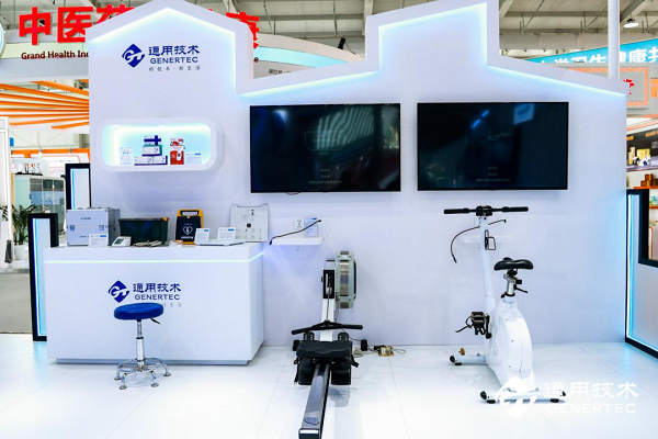 通用技术集团展区上的智能游戏单车和划船机