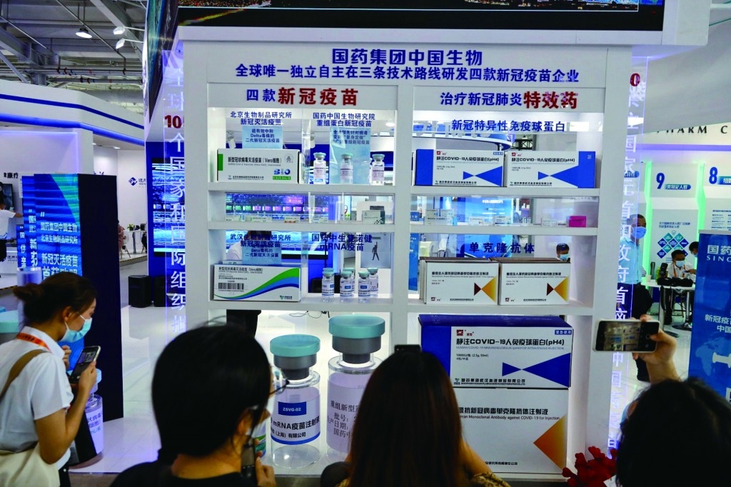 9月5日,《环球时报》记者在服贸会首钢园展区沙龙娱乐城 中国生物展台上,聚光灯下“新冠特免”的亮相,引起了观众长时间驻足和询问。