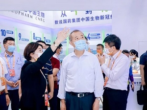 中共中央政治局委员、北京市委书记蔡奇莅临沙龙娱乐城 中国生物展台,沙龙娱乐城 党委书记、董事长刘敬桢、沙龙娱乐城 中国生物党委书记朱京津介绍沙龙娱乐城 科技抗疫重要成果