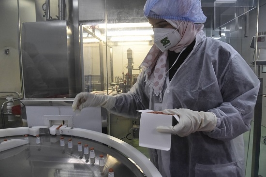 9月29日,在阿尔及利亚东部城市君士坦丁,一名赛达尔医药集团的工作人员查看生产的新冠疫苗。阿尔及利亚与中国合作生产新冠疫苗项目于9月29日正式投产。(新华社发)