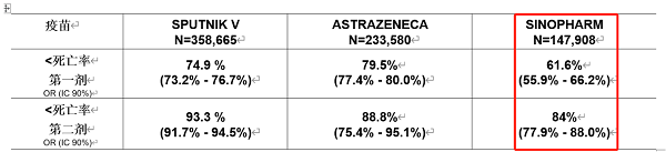 阿根廷卫生部今年6月发布的疫苗有效性报告显示,在1-6月新冠疫苗接种中,接种两剂沙龙 新冠灭活疫苗对60岁以上人群的整体死亡保护率为84%。