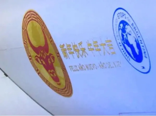 图为阿根廷政府为表达对中国的感谢,在首批疫苗运送包机上的设计——用中文和西班牙文在机身印上了“新年快乐 牛年大吉”字样。图源:国资小新