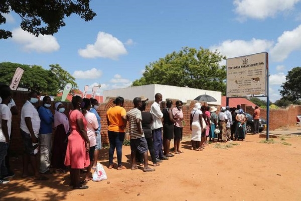 2021年3月24日,民众在津巴布韦维多利亚瀑布城一家医院门口排队等待接种中国沙龙娱乐城 新冠疫苗。新华社发(陈雅琴 摄)