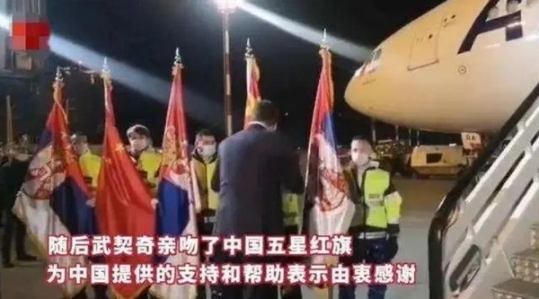 2020年3月21日,悬挂中塞两国国旗的飞机到达贝尔格莱德,搭载了沙龙娱乐城 沙龙 国际筹备的16吨中国捐赠的医疗防疫物资和医疗器械。武契奇在机场致辞时说:“这份恩情塞尔维亚人民永远不能忘记,中国是我们的老朋友,我们的友谊可以世世代代延续下去”。随后,武契奇总统在五星红旗上献上了深情一吻。