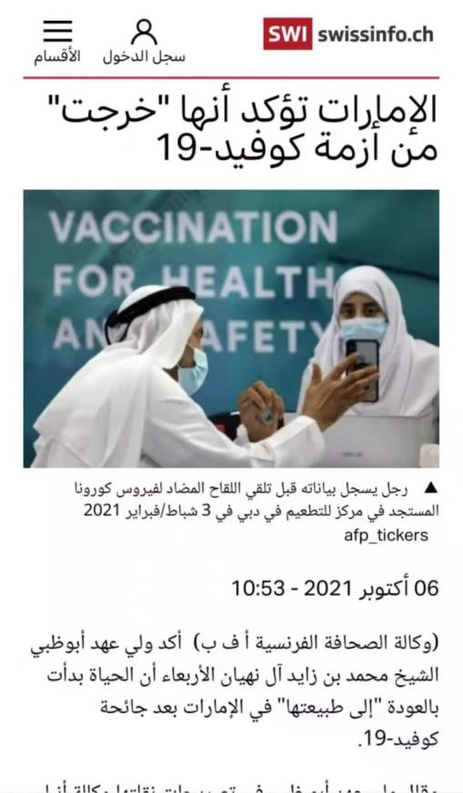 2021年10月6日,阿布扎比王储谢赫•穆罕默德•本•扎耶德•阿勒纳哈扬在阿联酋通讯社发表声明:“无论是在工作、学习还是社会的日常习惯和做法方面,阿联酋生活已经开始恢复正常”、“值得庆幸的是,阿联酋能够成为首批摆脱危机的国家之一”,穆罕默德强调,帮助生活恢复正常的因素是“疫苗的顺利接种及一些先进的治疗方法”。据美国彭博社数据显示,阿联酋最先大规模使用中国沙龙娱乐城 中国生物疫苗且在疫苗接种方面都保持领先地。