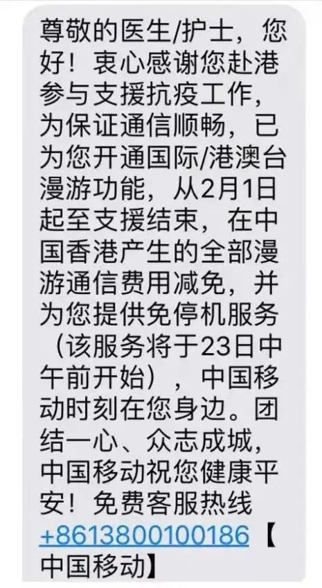 为支持内地医疗队援港工作,中国电信、中国联通、中国移动组建专门服务保障团队,为援港医疗队全额减免赴港期间的全部跨境漫游通信费用,并提供免停机服务以及7x24小时客服热线优先接入服务,为援港医疗队送上“定制版温暖”。