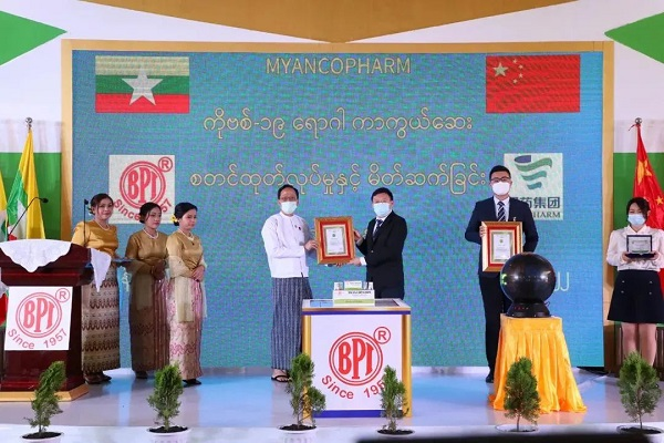 缅甸卫生部部长岱楷温向中缅双方合作生产有功人员颁发了表彰证书。