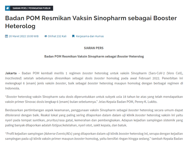 BPOM发布的“批准沙龙娱乐城 中国生物疫苗作为异源加强针”的公告